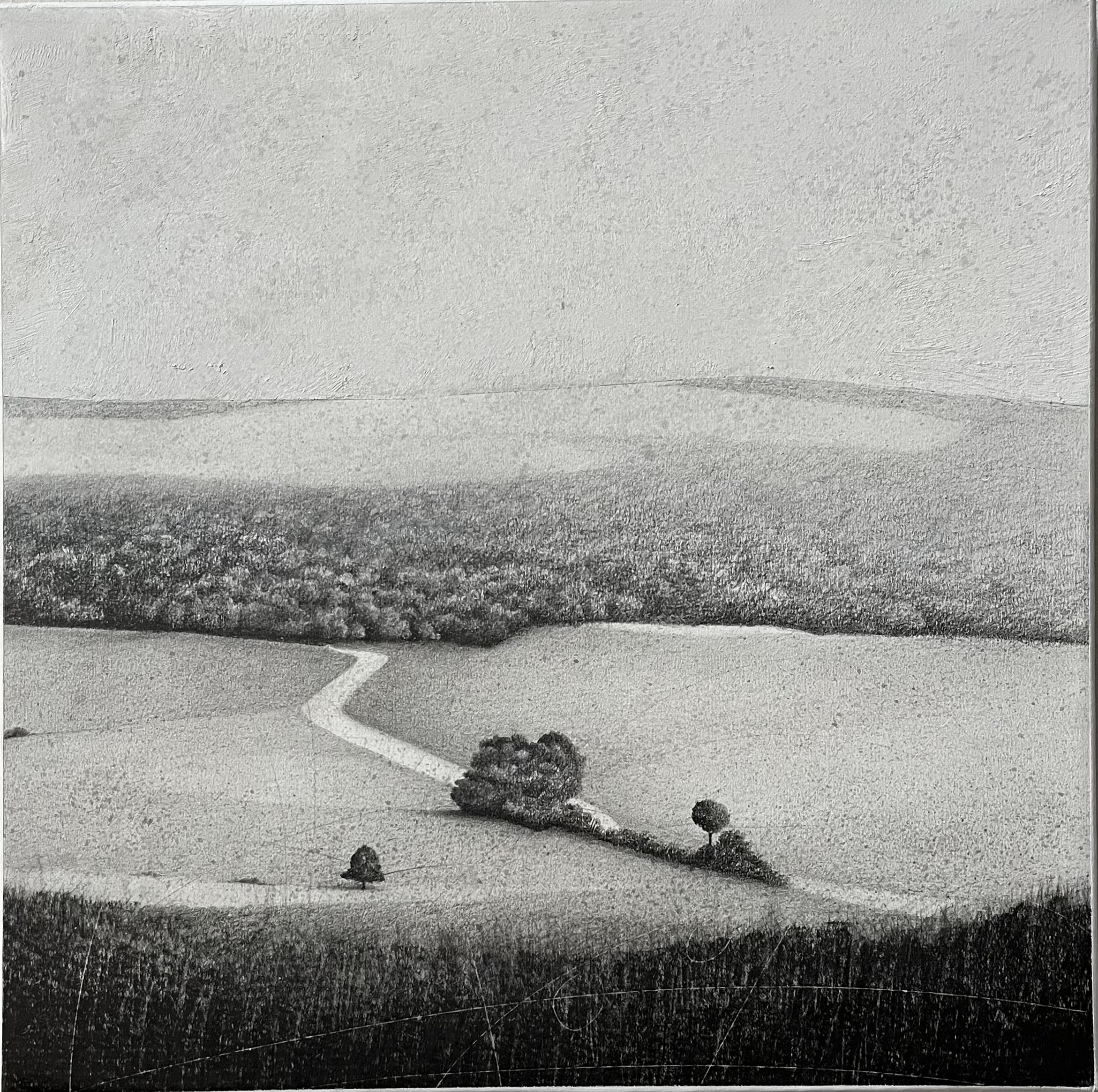 La mine de plomb afin d’apporter une légèreté dans le trait et donner cette impérieuse envie d’être aux pieds de ces arbres perdus dans ces champs ou sur ces pleines mystérieuses.