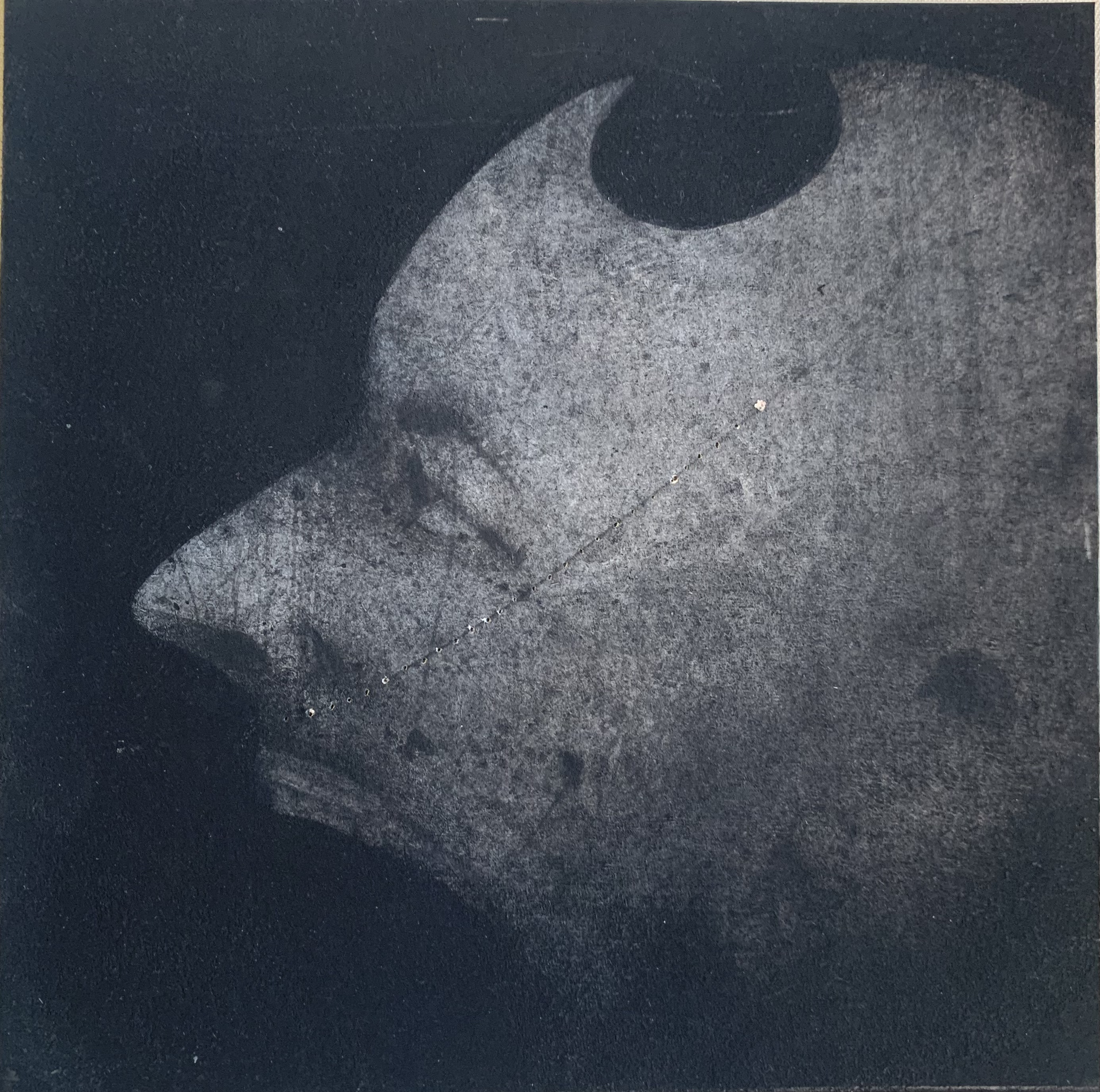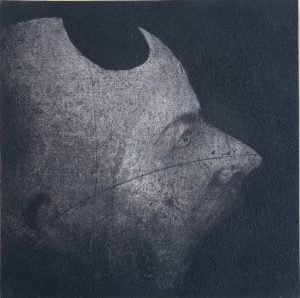 L’altération, les manques de certaines parties du visage, les masques qui cachent mais accentuent la blessure, la fragilité le doute, la peur et la perte d’identité dans le regard de l’Autre. Une volonté de s’interroger sur la fragilité et l’éphémère, ce qui nous marque, nous blesse… Un travail sur des supports qui placent le geste au coeur d’une même fragilité : papier de soie, papier de chine… Malmenés, brulés, chiffonnés, percés ou recousus grossièrement, ils accompagnent le trait, entrent en résonance avec le propos, dans la délicatesse comme la sauvagerie.